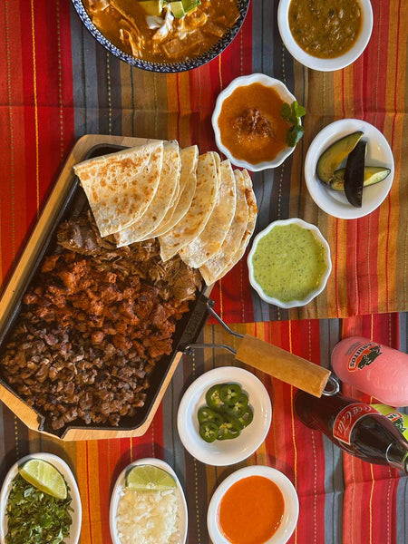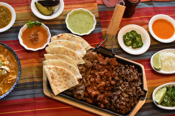 3 different kinds of meat: beef, marinated and pulled pork, 6 quesadillas, 2 tortilla soups, side of onions, cilantro, pineapple, lime & corn tortillas.